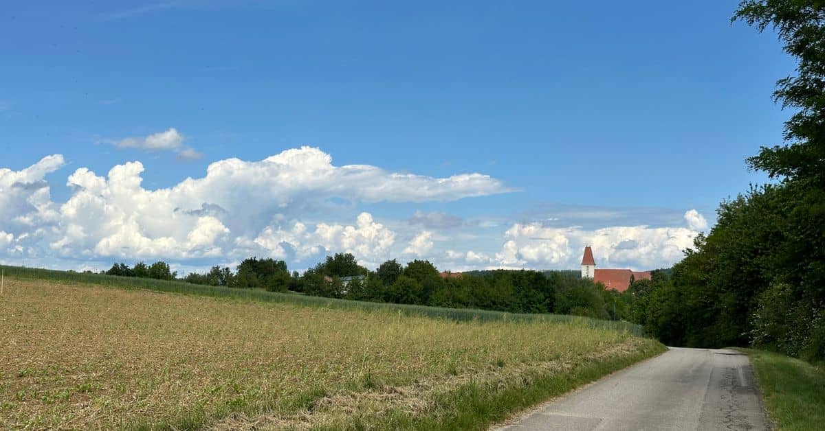 Ich bin von St. Pölten Innenstadt bis Pottenbrunn am Traisentalradweg gefahren. Von Pottenbrunn (am Friedhof vorbei) bis Kapelln über Maria Jeutendorf über den Radweg 403 und den Perschlingtal-Radweg. Ein Stück hinter der Hauptstraßenquerung in Kapelln zweigt der Mittelpunktradweg links ab. Diesem bin ich (vorbei an der Mittelpunktwarte) bis Ossarn gefolgt. Über weite Strecken entspricht dieser Weg allerdings keinem gut fahrbaren Fahrradweg. Zu tief geschotterte Abschnitte oder mit Regenwasser gefüllte Schlaglöcher sowie schlammige Wegstücke prägen das Bild.