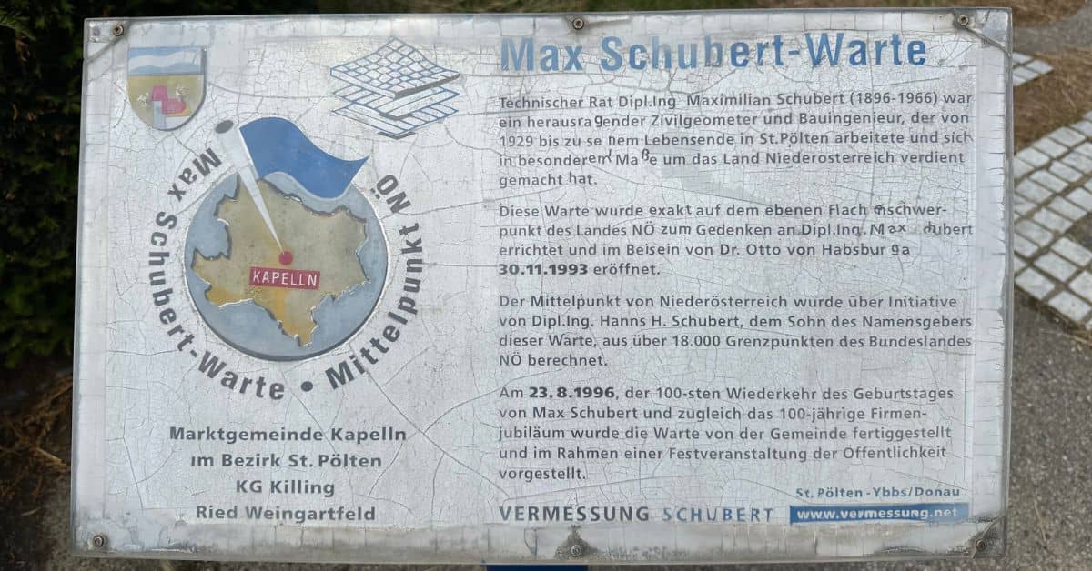Heute war ich mit dem Fahrrad bei der Max-Schubert-Warte, die den Mittelpunkt von Niederösterreich (NÖ) kennzeichnet, der in der Gemeinde Kapelln (nahe St. Pölten), genauer gesagt in Oberkilling, liegt. Die Warte ist nach dem Geometer Maximilian Schubert benannt, dessen Todestag sich am 18. Juni zum 58. Mal jährt. Bereits im Jahr 1936 hat Maximilian Schubert den erste Flächenwidmungs- und Bebauungsplan von St. Pölten im 6‑Farb-Druck erstellt.